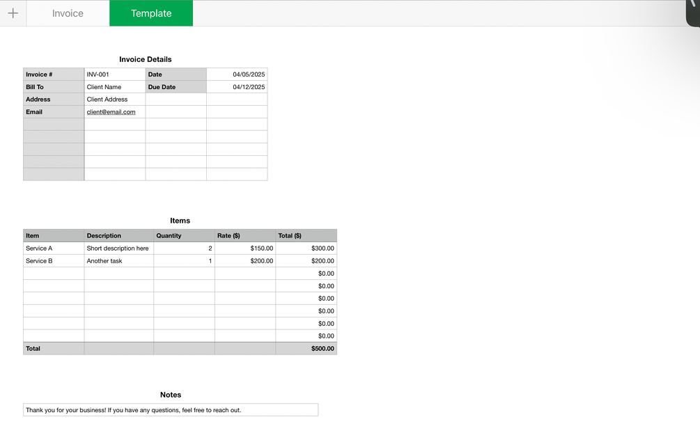 - A ready-to-use invoice template designed in Apple Numbers